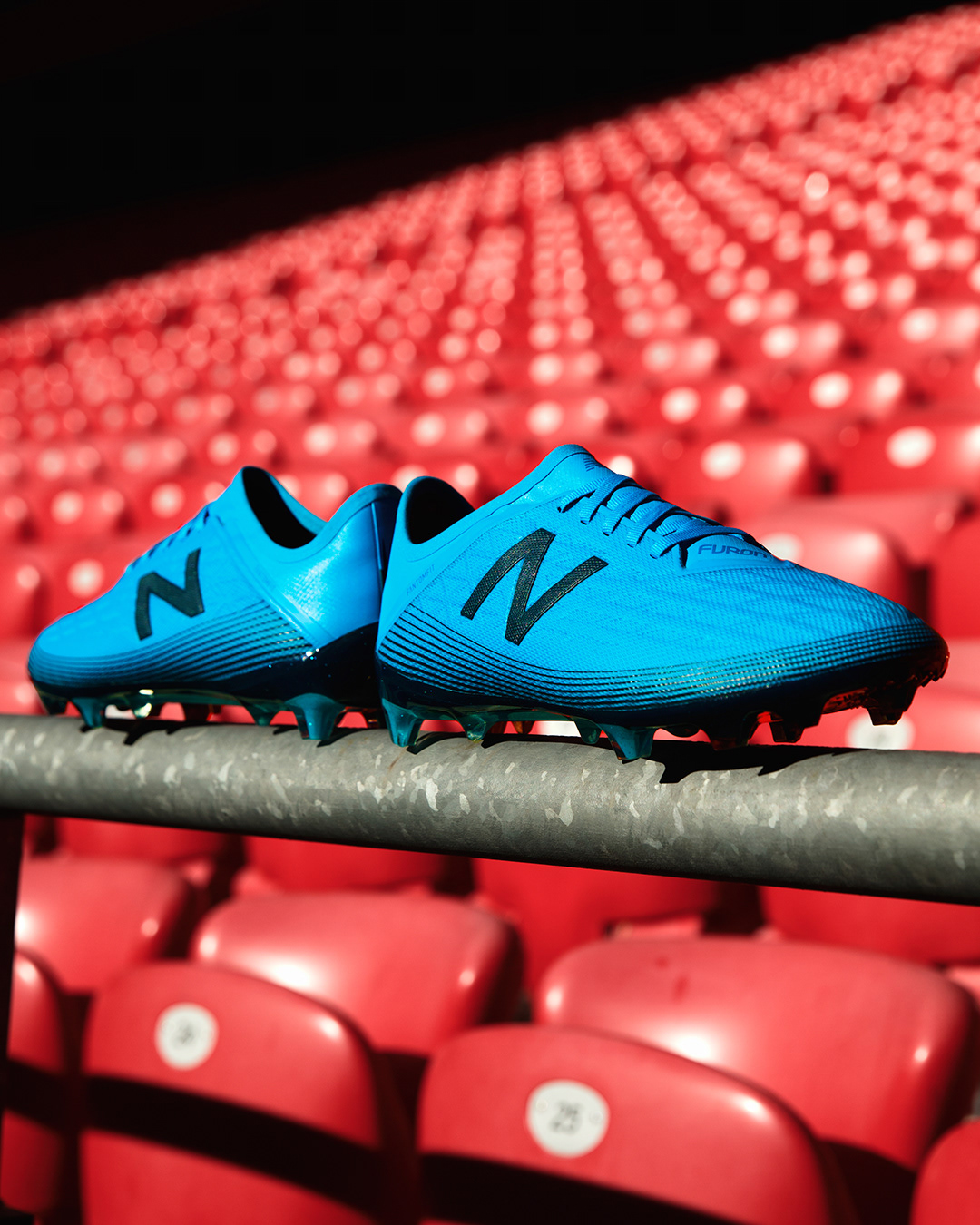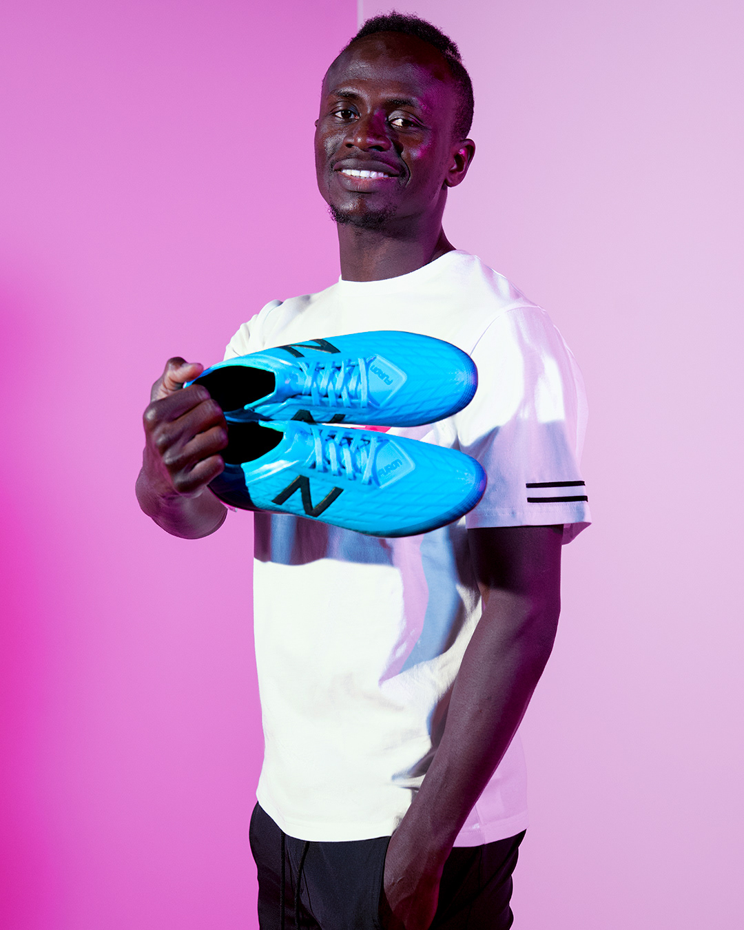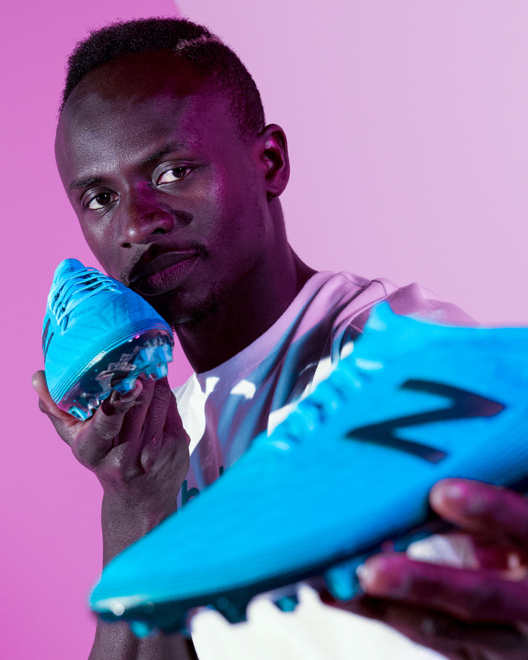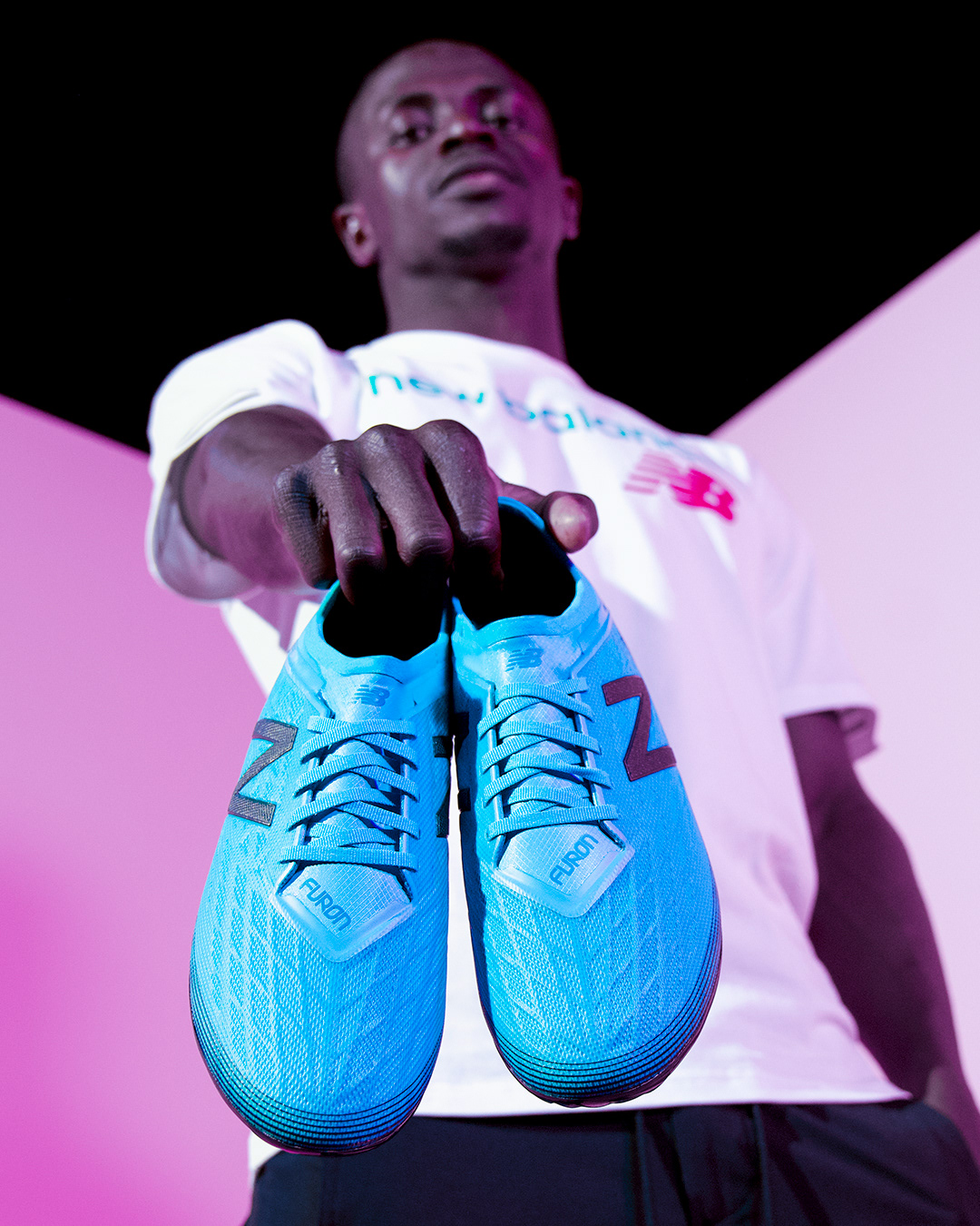 Social media stills supporting the launch of the Deep Ozone Blue/Bayside Blue colourways for the New Balance Furon V5 and Tekela V2 football boots, featuring Liverpool FC and Senegal star Sadio Mané.